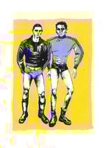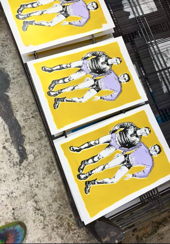 Pulling from queer sportwear scenes, this print celebrates the tease: pants, leather boots, and bare legs.